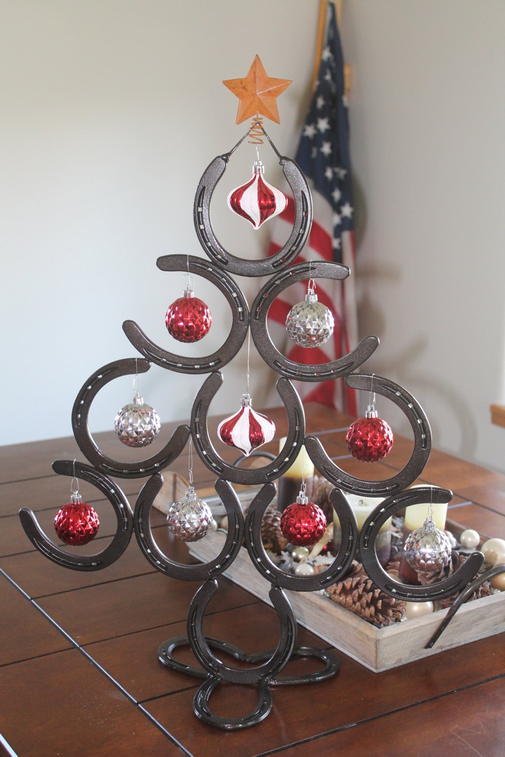 Horseshoe Christmas tree made with new horseshoes fully welded and powder coated in a professional finish to last a lifetime. This tree is the perfect accent to any holiday decor and can show off your favorite ornaments and star perfectly. This is our lucky tree as the shoes are upside right so the luck doesn't fall out! The nails are welded on top to hold your favorite star or angel. This tree is 24 inches tall, 20 inches wide and 8 inches deep. If you do not want any paint just the natural horseshoe look pick a clear coat. STAR MAY DIFFER FROM PHOTO. All items are handmade of all new materials.